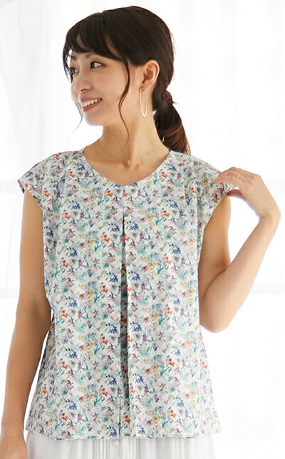 モデル身長:164cm 着用カラー:ホワイト 軽やかなフラワープリント 優しい雰囲気のマタニティ兼用トップス 授乳口が目立たないセンターオープンタイプは卒乳後も長く着て頂けます。